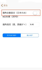 ③偏角自動設定(日本のみ)がオン(緑色)になっているので、オフ(白)にします。