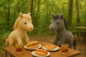 金色の朝日を浴びながら、小道を歩くフェルトの馬。努力が実を結ぶ象徴のような穏やかな森の風景。