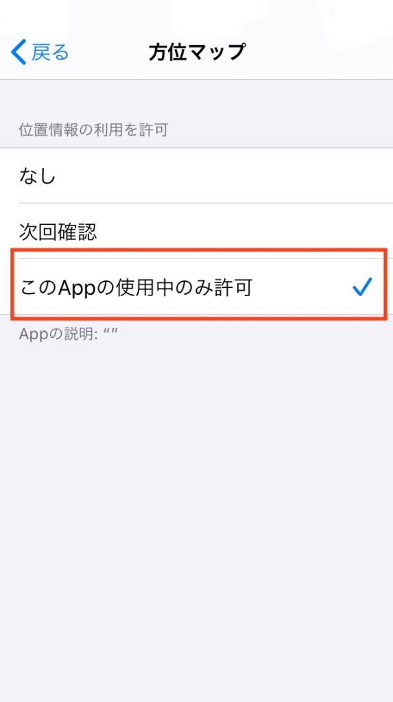 ★ホーム画面/設定/「方位マップ」アプリをタッチ/「このAppの使用中のみ許可」に✔