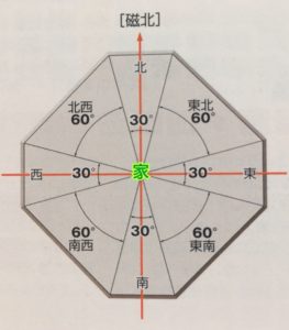 自宅を中心と考えて、東西南北を30℃、それ以外の方位を60℃と考えます。