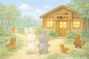 やさしの森に、ちいさな木の本屋さんがあります。